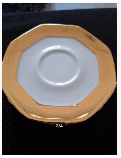 Merk Schirnding Bavaria4 Koppen en 4 schotelsKoppen zijn goudkleurigSchotels hebben een goudkleurige randHoogte koppen 6 cmDiameter koppen 7 cmDiameter schotels 13 cm