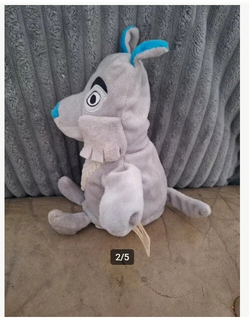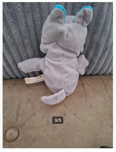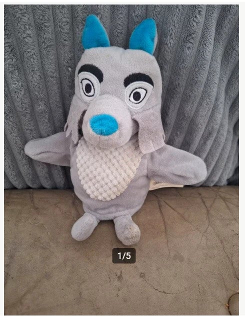Van FabeltjeskrantKnuffel Bor de wolf, handpopGrijsMet blauwe neus en oren22 cm hoog12 cm diep12 cm breed