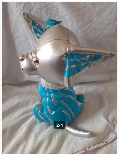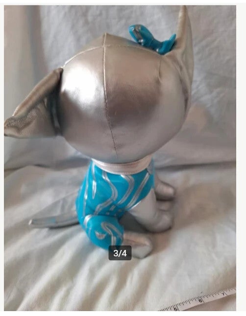 HondVan we ❤️ 2 playRuimte hond knuffelZilverkleurigMet blauw pakBlauwe strik op de kop25 cm hoog23 cm diep14 cm breed