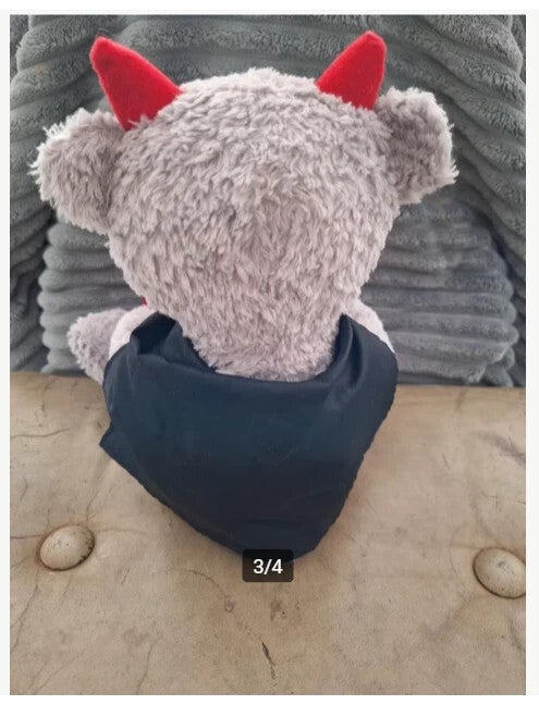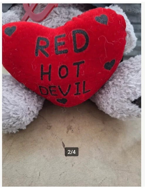 BeerRed Hot devil knuffelHart in de handen met tekst "Red Hot devil"Van BerentoysGrijsMet zwarte cape24 cm hoog17 cm diep18 cm breed