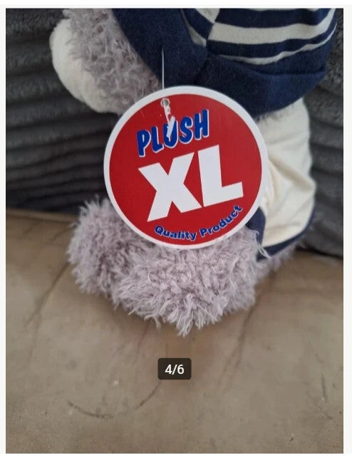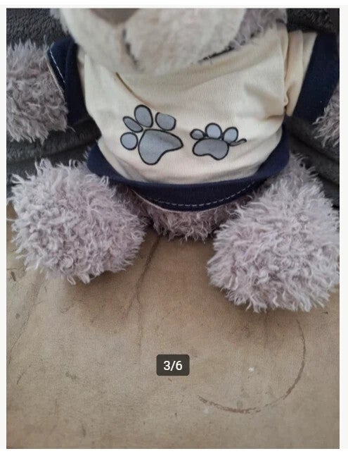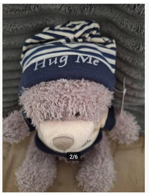 BeerHug me knuffelVan Plush XLGrijsMet crème blauwe trui en mutsOp de muts staat "hug me"Op de trui staan 2 pootjes20 cm hoog14 cm diep10 cm breedNieuw met kaartje