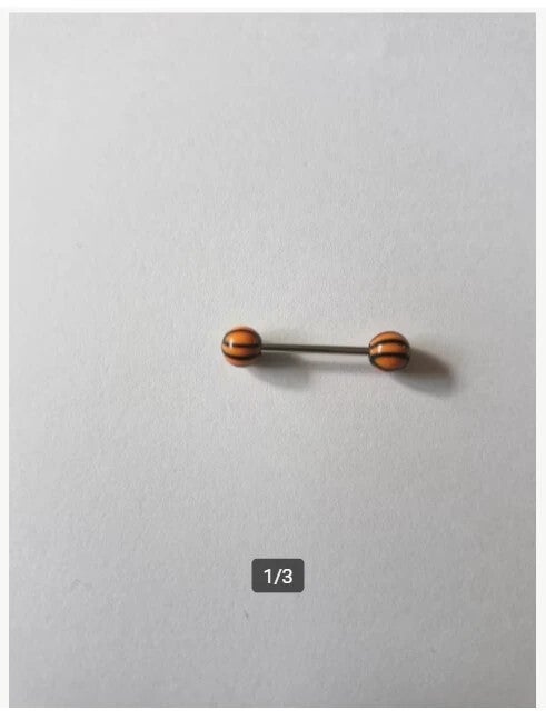 Tongpiercing oranje met zwarte strepen Nr3 Roestvrij staal2mm dik6mm balletje15mm staafje 26mm lengte piercing Nieuw