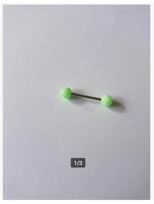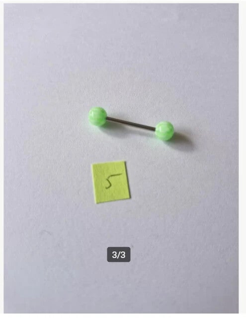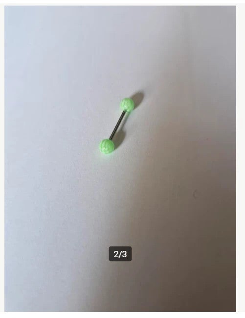 Tongpiercing lichtgroen met witte strepenNr5Roestvrij staal 2mm dik6mm balletje 15mm staafje 26mm lengte piercingNieuw