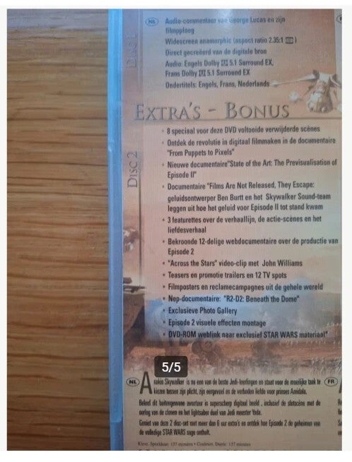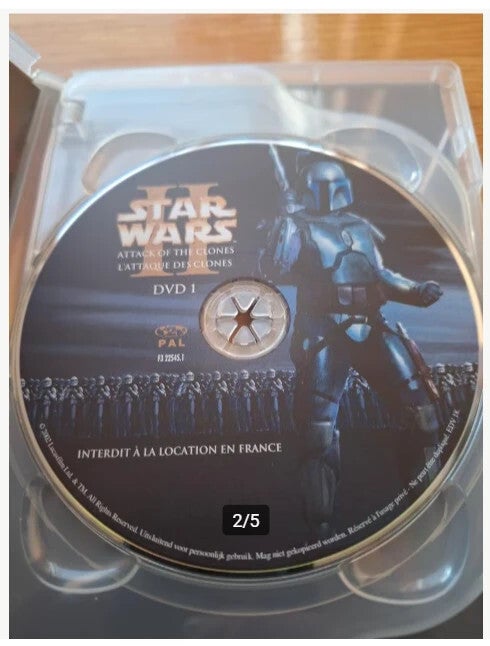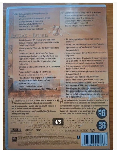 Avontuur2 discs Dvd Star wars, atrack of the clones Vanaf 6 jaarEngels en Frans gesproken Nederlands, Engels en Frans ondertiteld Speelduur 137 minuten