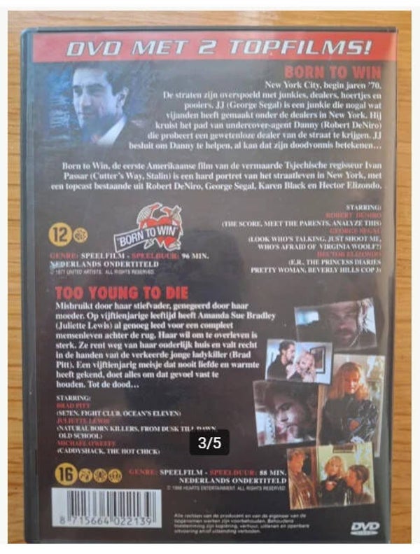 Misdaad Dvd box born to win en too young to die- Born to win: Vanaf 16 jaarEngels gesprokenNederlands ondertiteldSpeelduur 96 minuten-Too young to die Vanaf 16 jaarEngels gesprokenNederlands ondertiteldSpeelduur 88 minuten