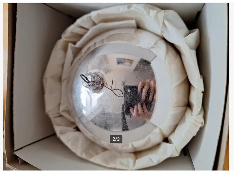 Grote zilverkleurige glazen kerstballen Feinster glassmuck ZilverkleurigGrootste bal is 13 cm doorsnede Kleinere bal is 11 cm doorsnedeTussen 25 en 30 jaar oudGebruikt maar zeker goed voor volgende ronde