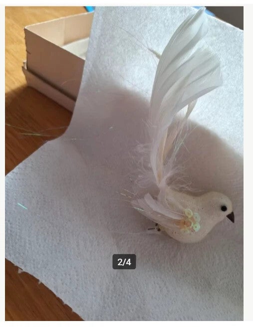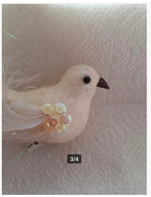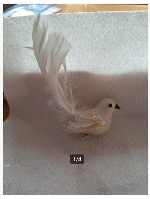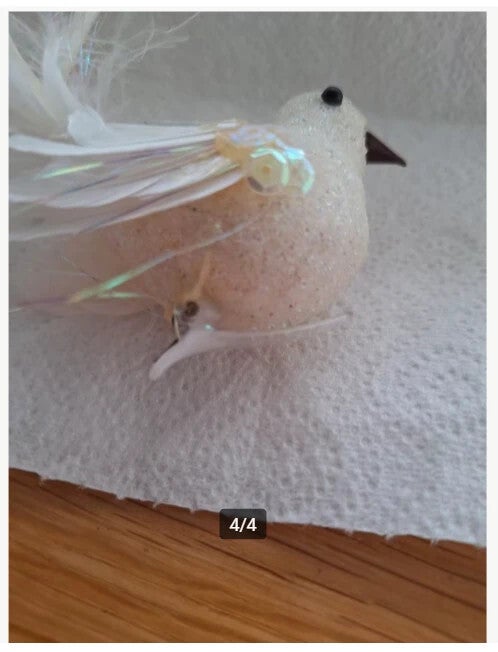 Witte vogel op clipPiepschuimWitte glitter Pailletten aan begin van de vleugelsKraal oogjes en zwarte snavelGrote veren staart met gekleurde draden