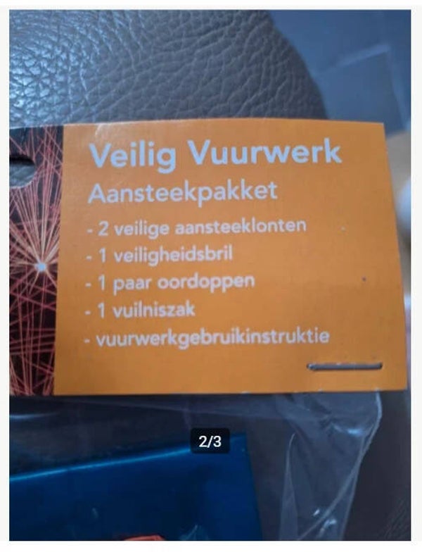 Veiligheidspakket vuurwerkVoor veilig afsteken vuurwerk In het pakket zit:- 2 aansteeklonten -1 veiligheidsbril - 1 paar oordoppen- 1 vuilniszak- vuurwerk gebruiks instructie 16x aanwezig (prijs is per stuk)