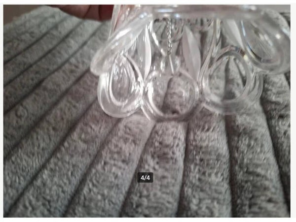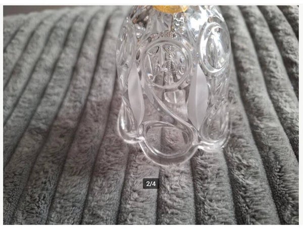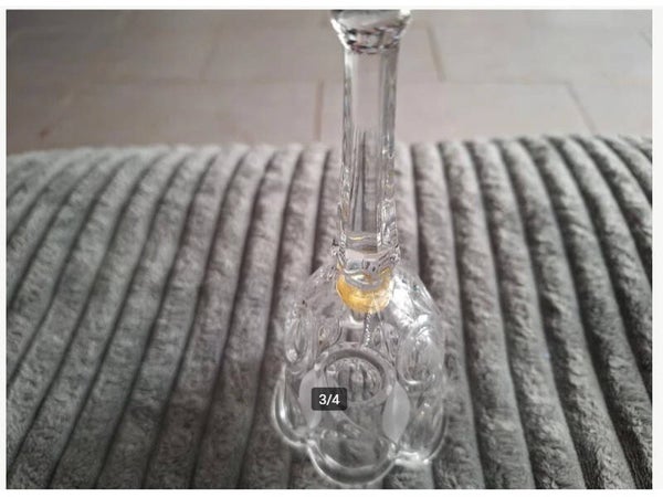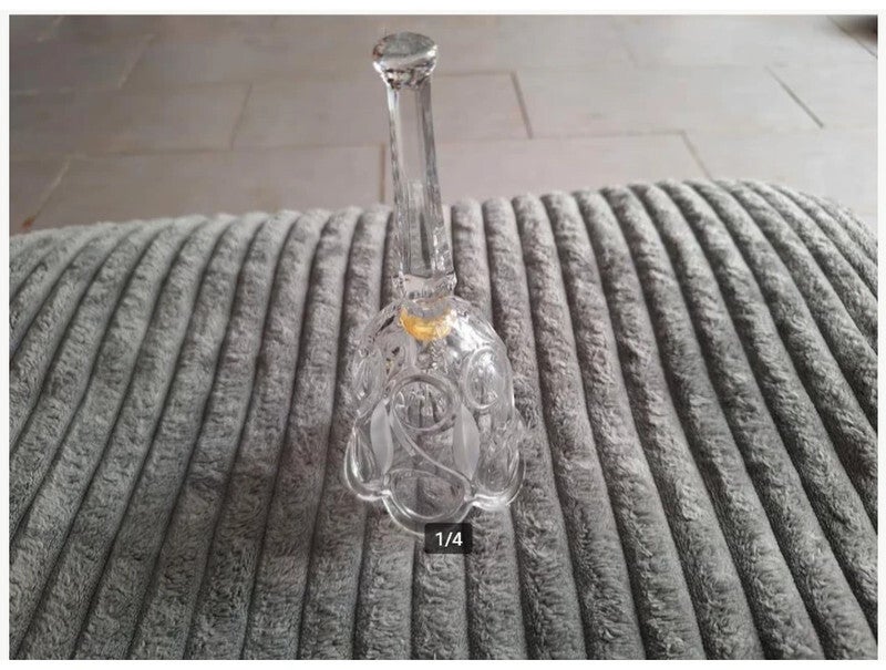 AntiekGlazen tafelbelAan de zijkant grote krullen in gegraveerdHandvat heeft 6 hoekenIn het midden, binnenin, zit een zilverkleurige hanger met balletje voor het bellen18,5 cm hoog9 cm doorsnede