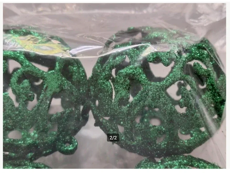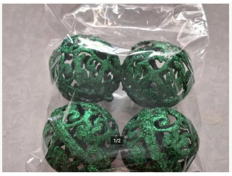 4 opengewerkte groene kerstballenKunnen opgehangen worden(hebben alleen een oogje, geen haakje)Met glitterOngeveer 5,5 cm doorsnede