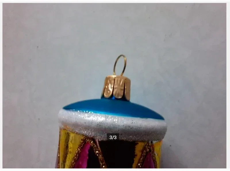 Vintage kleurige trommelVoor bv kerstboomBoven- en onderkant zijn blauwTussenstuk goudkleurig en rose5 cm langCa 3,5 cm doorsnede