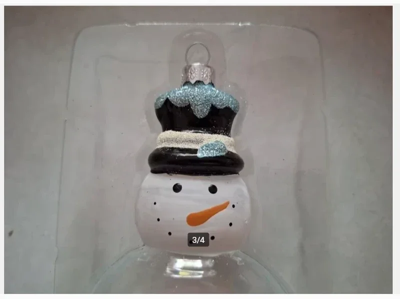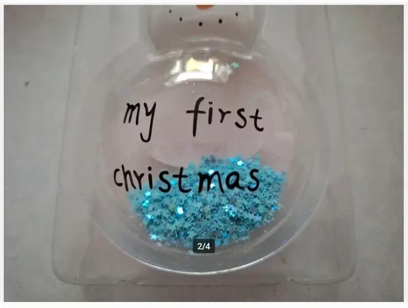 My first christmas sneeuwpopGlasMet blauwe sterretjes erinKan opgehangen worden14,5 cm langCa 7 cm breedCa 2 cm dik
