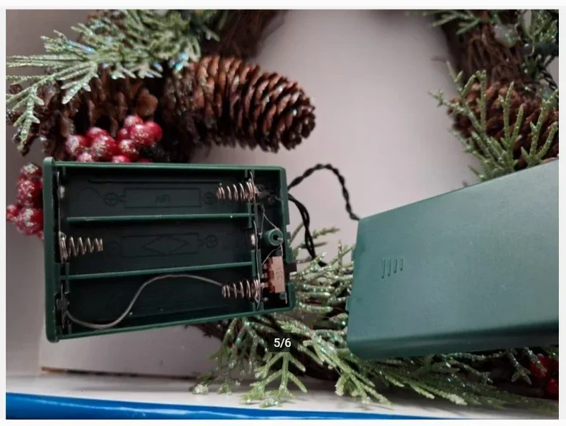 Kerstkrans in bel-vormMet lichtVersierd met dennenappels en besjesGlitter op de takkenWerkt op 3 aa batterijen30 cm lang22 cm breed