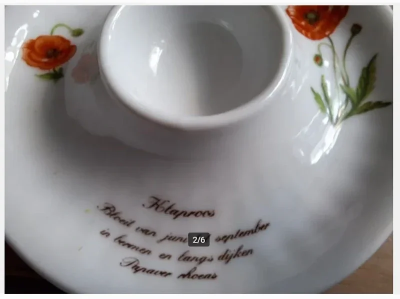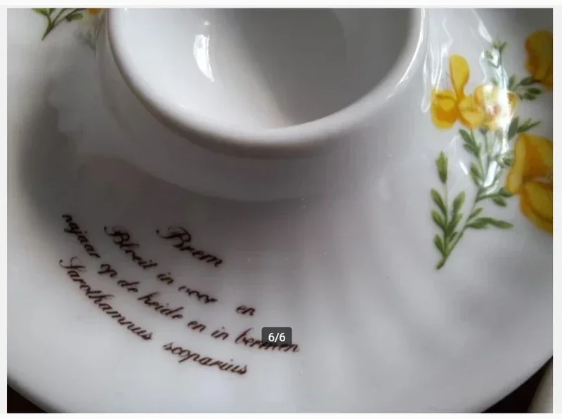 Set van 5 eierdopjesBloemenserieBij elke bloem staat een omschrijvingKlaproosGele lisVergeet mij nietKoekoeksbloemBremUitgegeven door Libelle