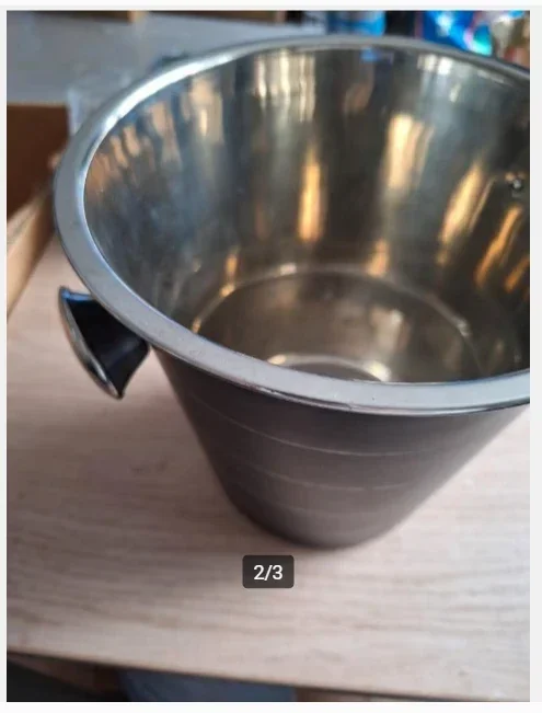 Champagne koeler zwartMet 2 handgrepenZilverkleurige, horizontale strepenVan ICN20,5 cm hoogCa 25 cm breed aan bovenkantCa 20 cm doorsnede binnenzijde