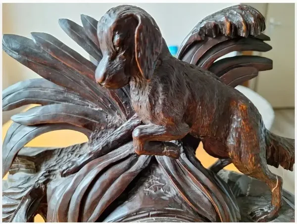 Gemonteerd op een golvende voet met een gegoten rand, vormt de naturalistische achtergrond met rotsen, boomtakken, bladeren, 2 vogels