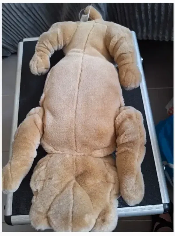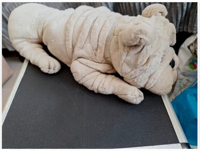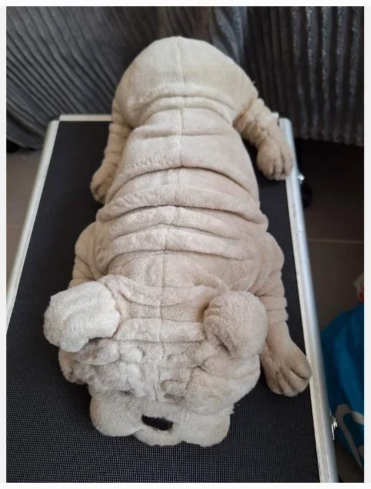 Knuffel hondZonder merkSharpei hondGrijze vachtLichtbruine buikLiggend39 cm lang19,5 cm breed11 cm hoogGewassen, daardoor merklabel gescheurd