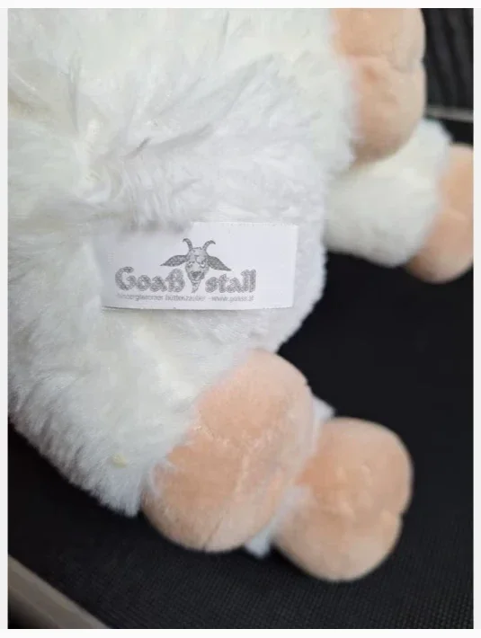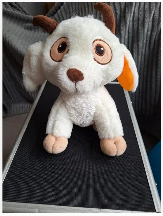 Geit knuffelMet grote ogenCreme wit met oranje witte orenBruine hoornsMerk Goaß stallHinterglemmer hütenzauber25 cm hoog20 cm breed20 cm diep