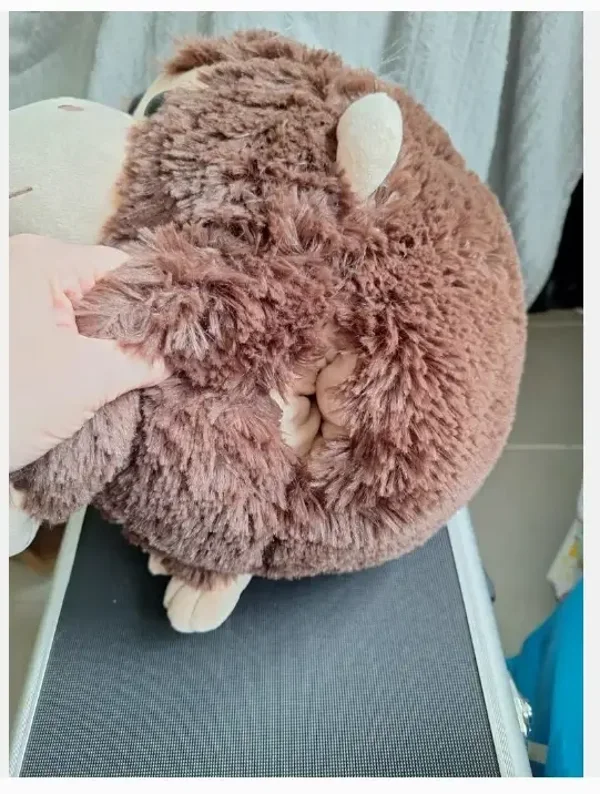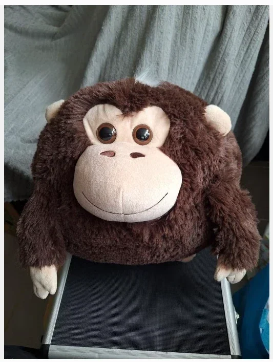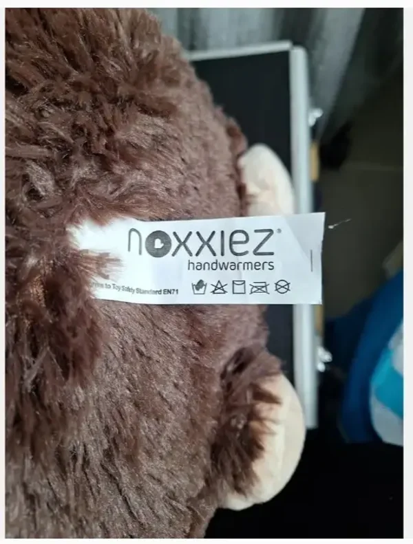 HandwarmerMerk NoxxiezBruine aapDonkerbruin plucheNeus, oren, handen, snuit en binnenkant beige fleece stofGrote bruine ogenRond29 cm hoog39 cm breed31 cm diep