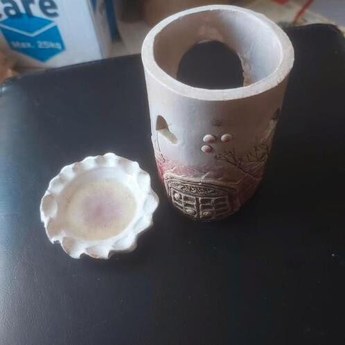 Bestaat uit 2 delenVan NouvelleOnderste deel is aan de achterzijde open voor een waxinelichtjeSchaaltje kan er bovenop met geurolieHandgemaakt13 cm hoogØ 8,5 cm
